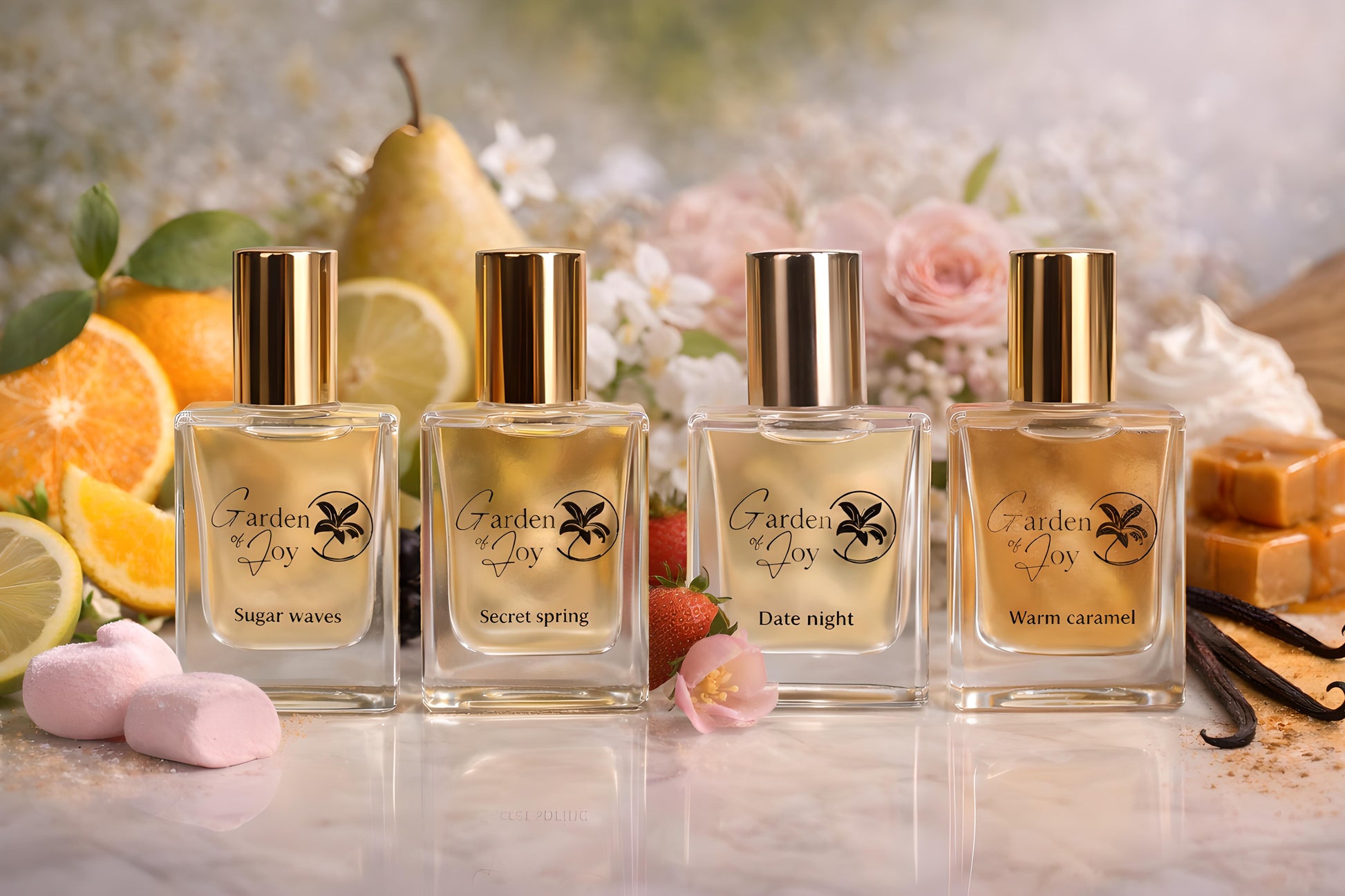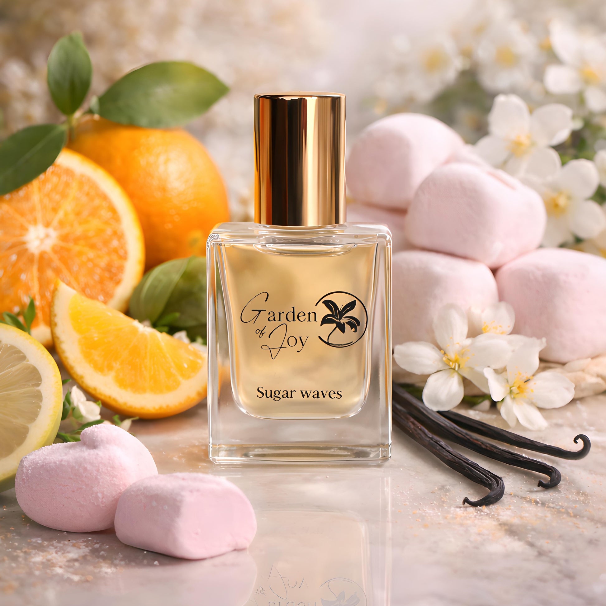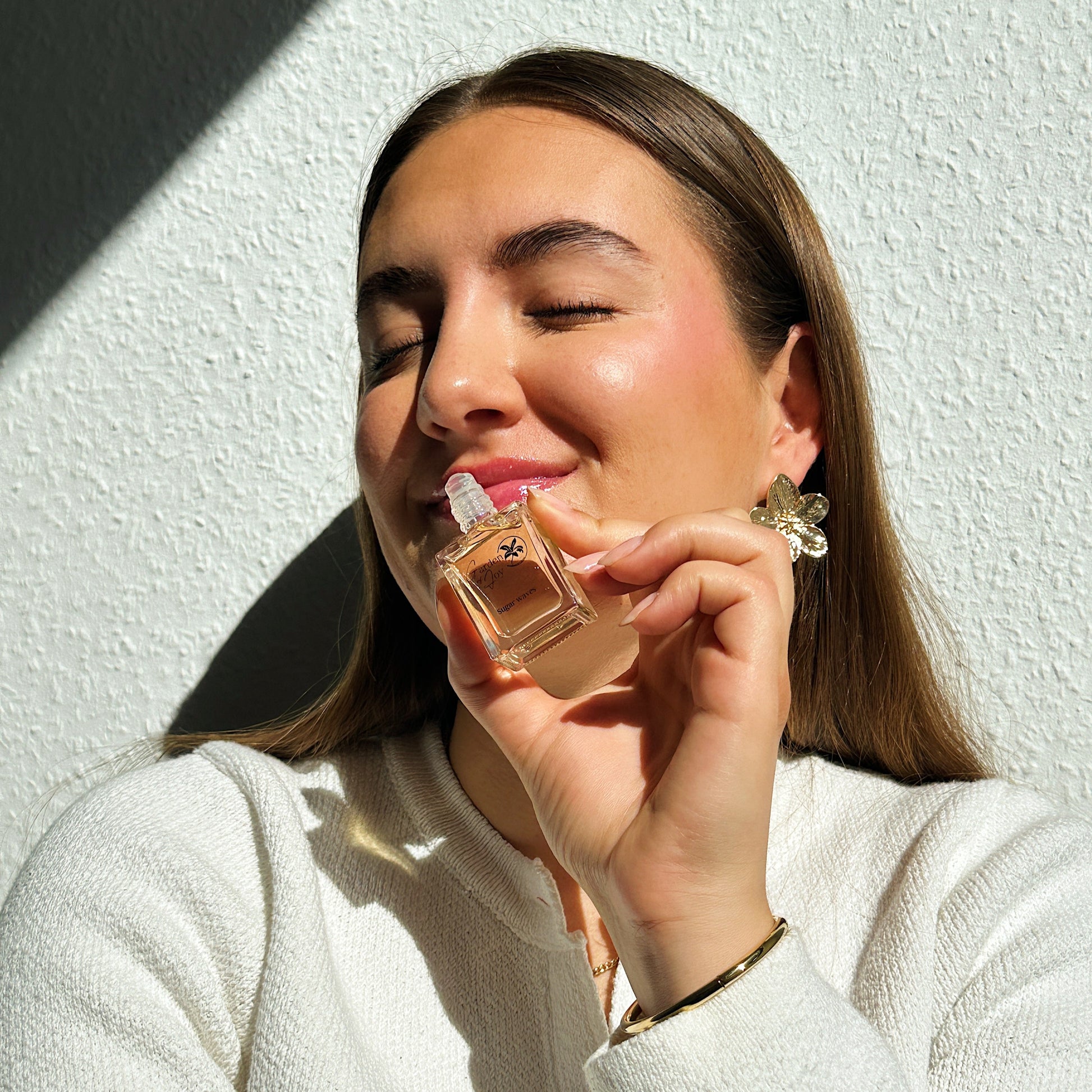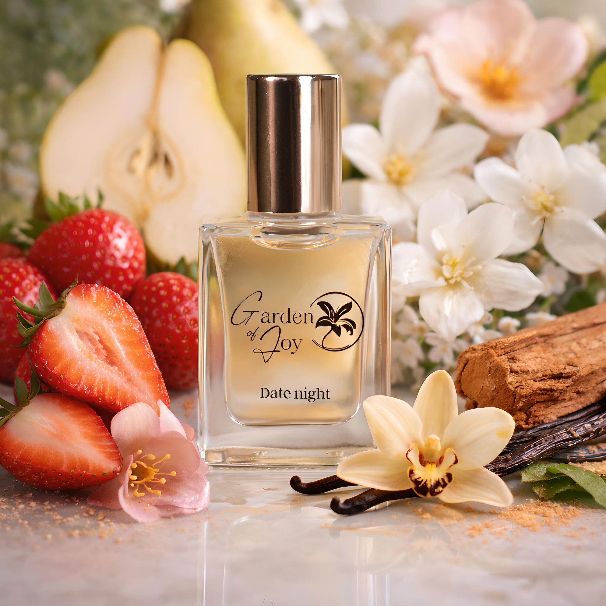 Sonnengereifte Erdbeeren und saftige Birnen vereinen sich mit den floralen Noten von Jasmin- und Pfirsichblüten, sanft vollendet durch warme Akzente von Vanille und Sandelholz.